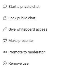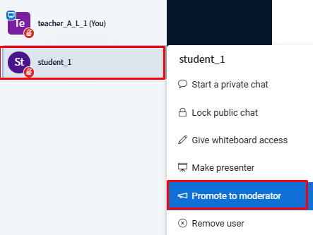 Choose Promote to Moderator to give a participant full moderator privileges (e.g., managing others, controlling features).
