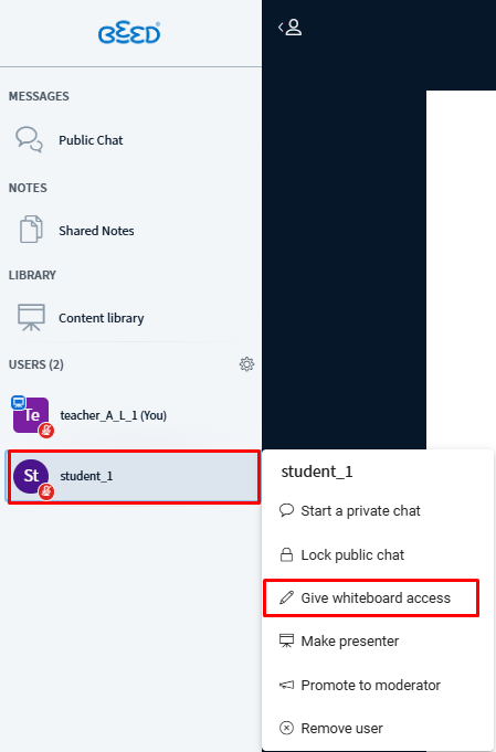 Give Whiteboard Access (This feature can be done by the Educator/Moderator only)