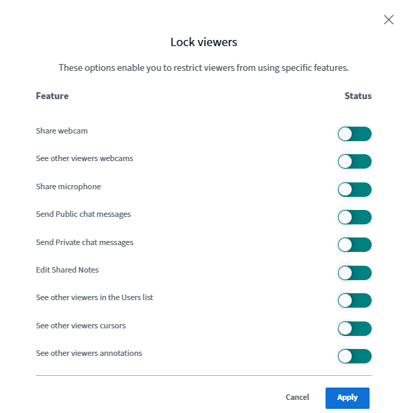 Lock Viewers – Lets moderators restrict certain features for participants, such as chat, webcam, microphone, or note editing, to control what viewers can do during the session.