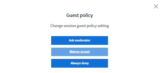 Guest Policy – Determines how guests can join the session. You can choose whether they must ask the moderator for approval, are always accepted automatically, or are always denied.