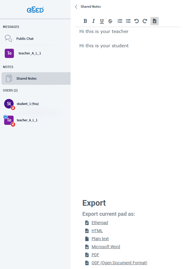 - Collaborative feature in B-Meet that allows all participants to write, edit, and view notes together in real time during a live session. It’s useful for summarising key discussion points, listing important links or resources, and keeping a shared record of what was covered in the meeting. All updates made in the Shared Notes area are instantly visible to everyone.
