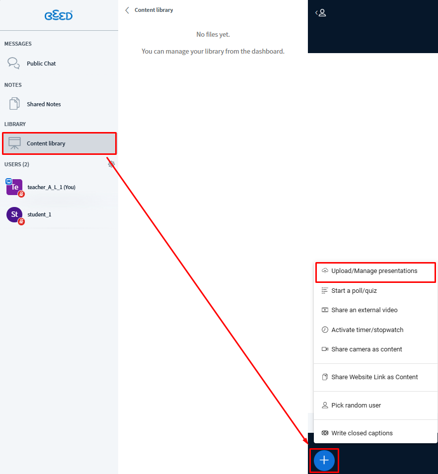 - Content Library in B-Meet is a place where educators and moderators can upload and manage their teaching materials. You can store files like slides, documents, images, or videos and easily share them during a live session. It helps keep all your resources organised and ready to use anytime.
