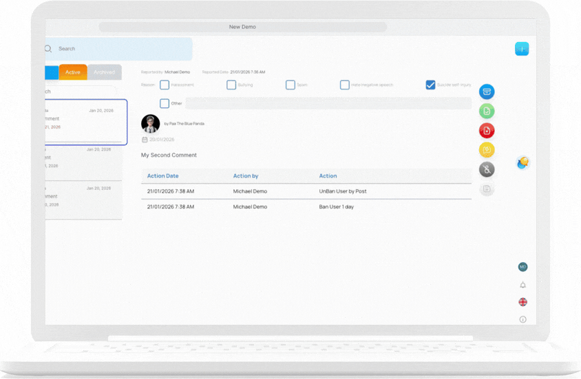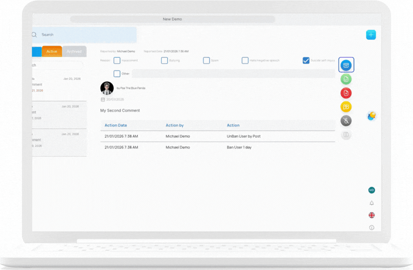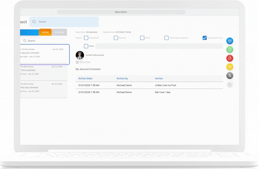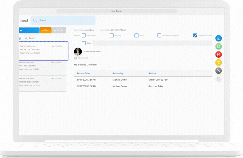 Archived reports are still stored in the system for reference but will no longer appear in the active report list. This allows Admins or Educators to maintain proper documentation while ensuring the moderation workspace stays clean and easy to manage.