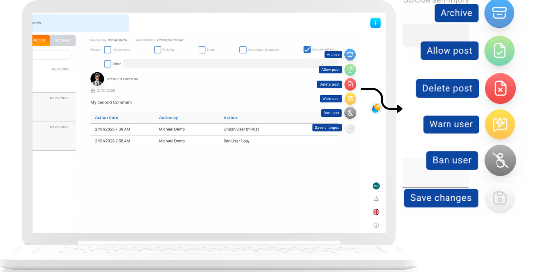 A centralised space to review reported posts, messages, or activities.