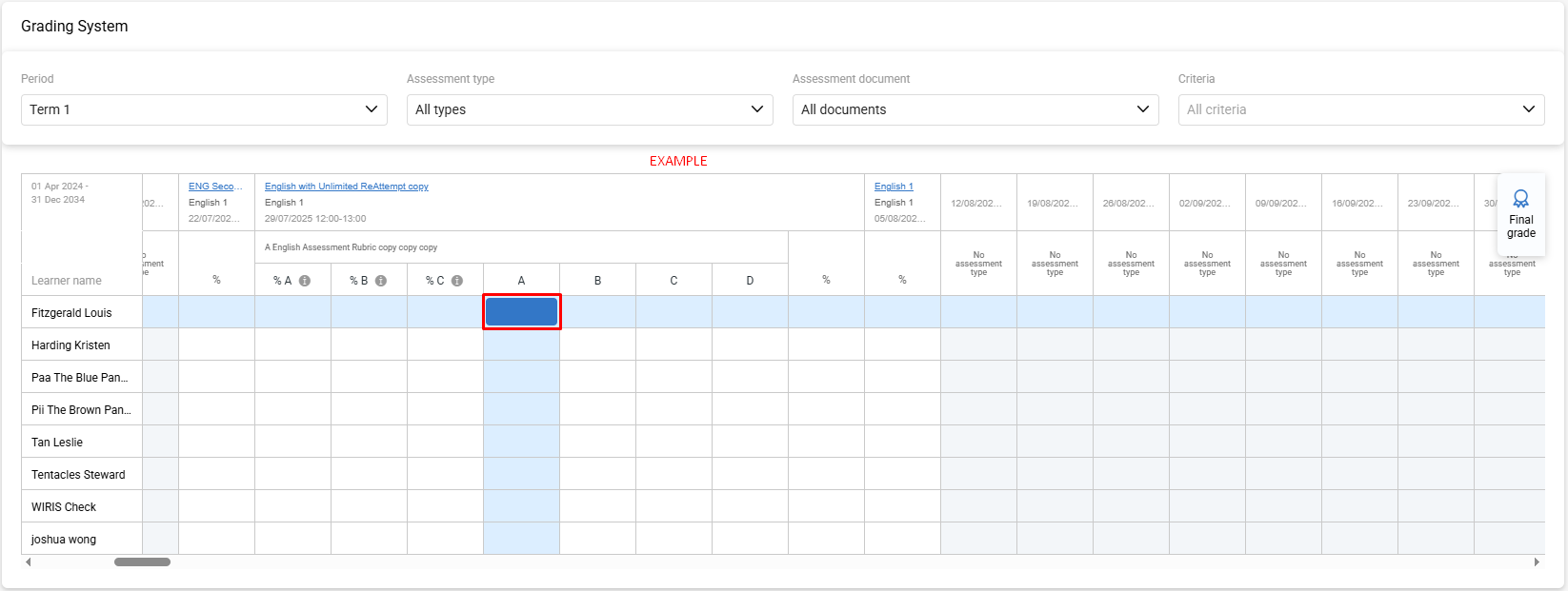 - Click the cell (Empty Box) between the student’s name and the assessment.