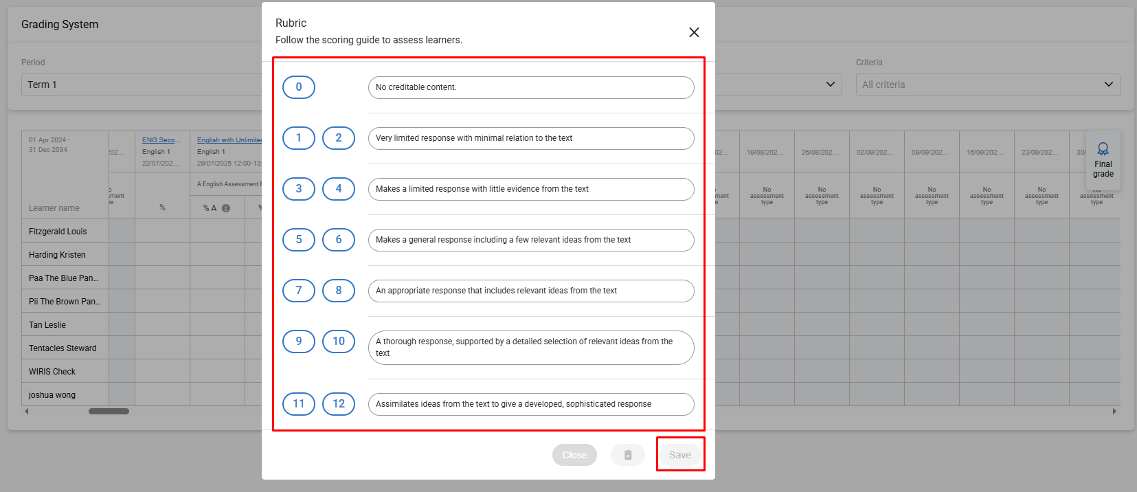 - A Rubric menu will appear. Select the learner’s score, then click Save