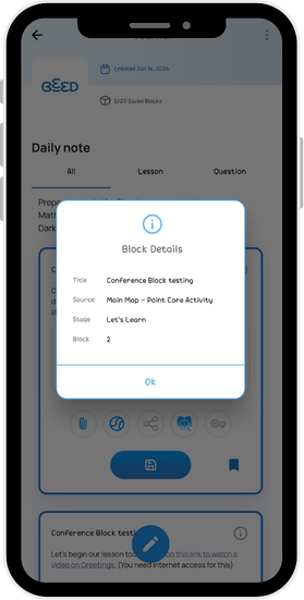 Ikon Info (i): Menampilkan detail asal blok, seperti dari pelajaran atau tahap (stage) mana blok tersebut disimpan.