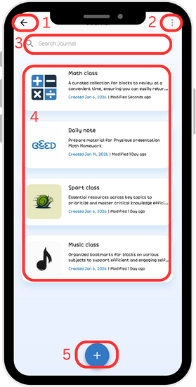 Daftar Journal: Menampilkan seluruh entri Journal. Entri yang terakhir diperbarui atau diedit akan muncul paling atas (urut menurun). Ketuk Journal untuk membuka dan mengeditnya.